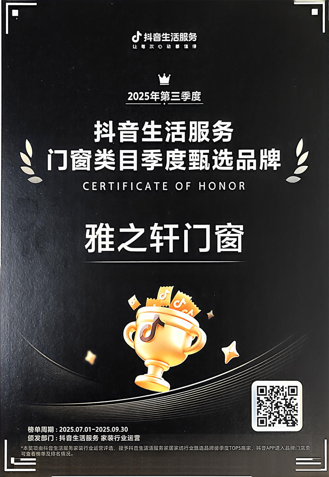 荣耀登榜!雅之轩门窗荣获抖音生活服务门窗...